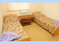 В номере (макс. 2+1 чел.): ~12 кв. м, две односпальные кровати, журнальный столик, телевизор, пуфик, стенка, холодильник, в с/у поддон, шторка, необходимые банные принадлежности (мыло, шампунь, т.бумага).